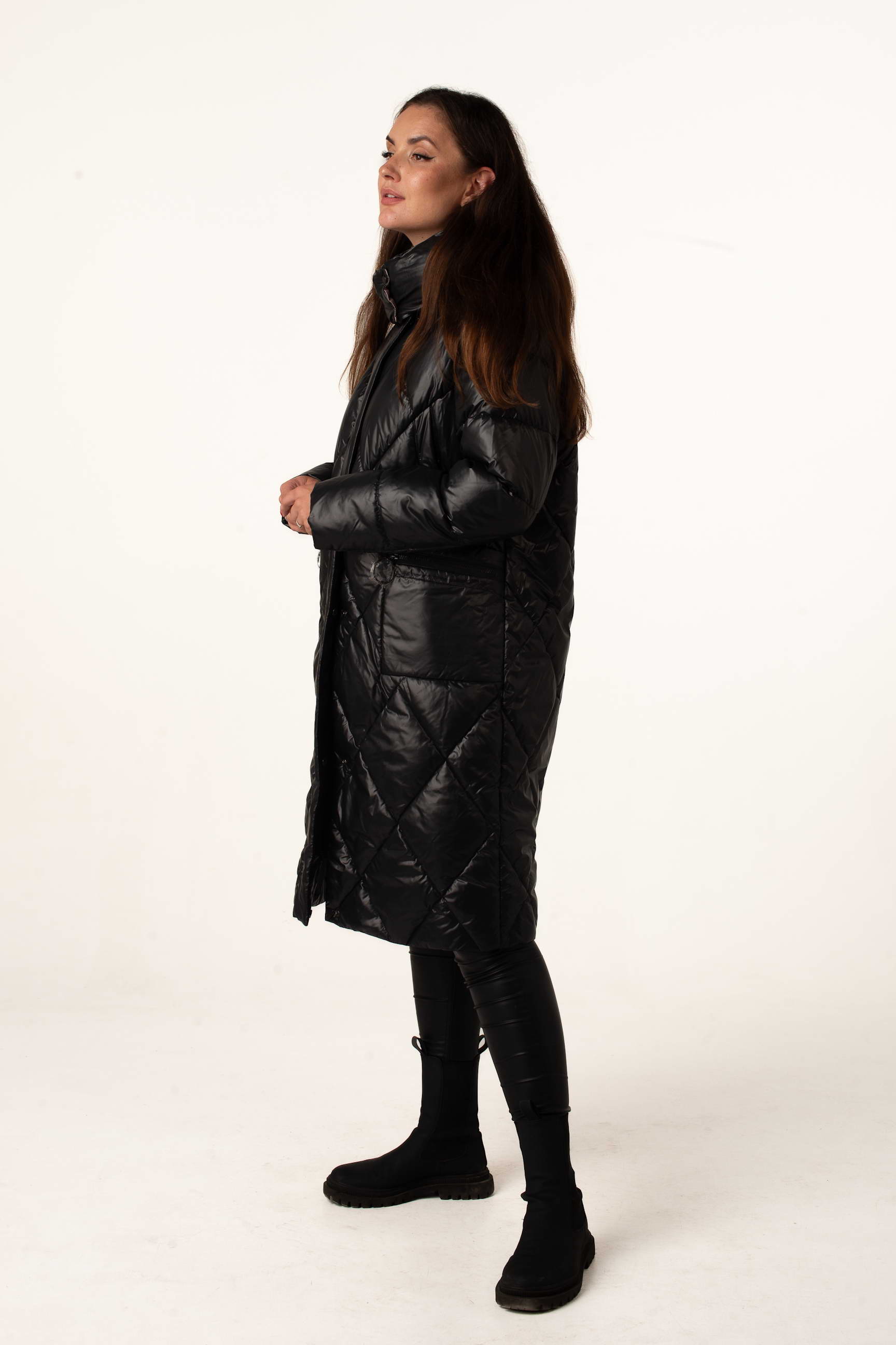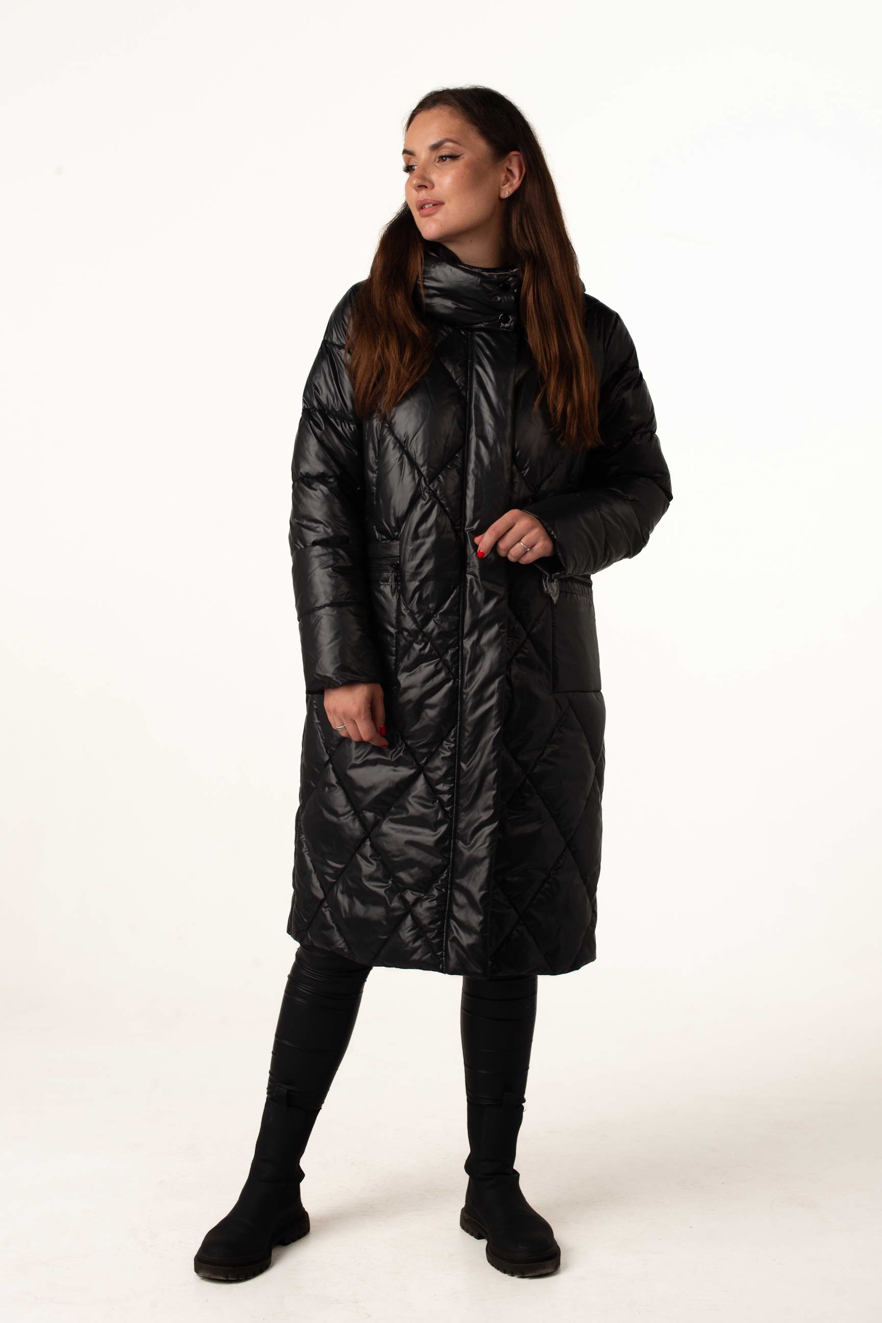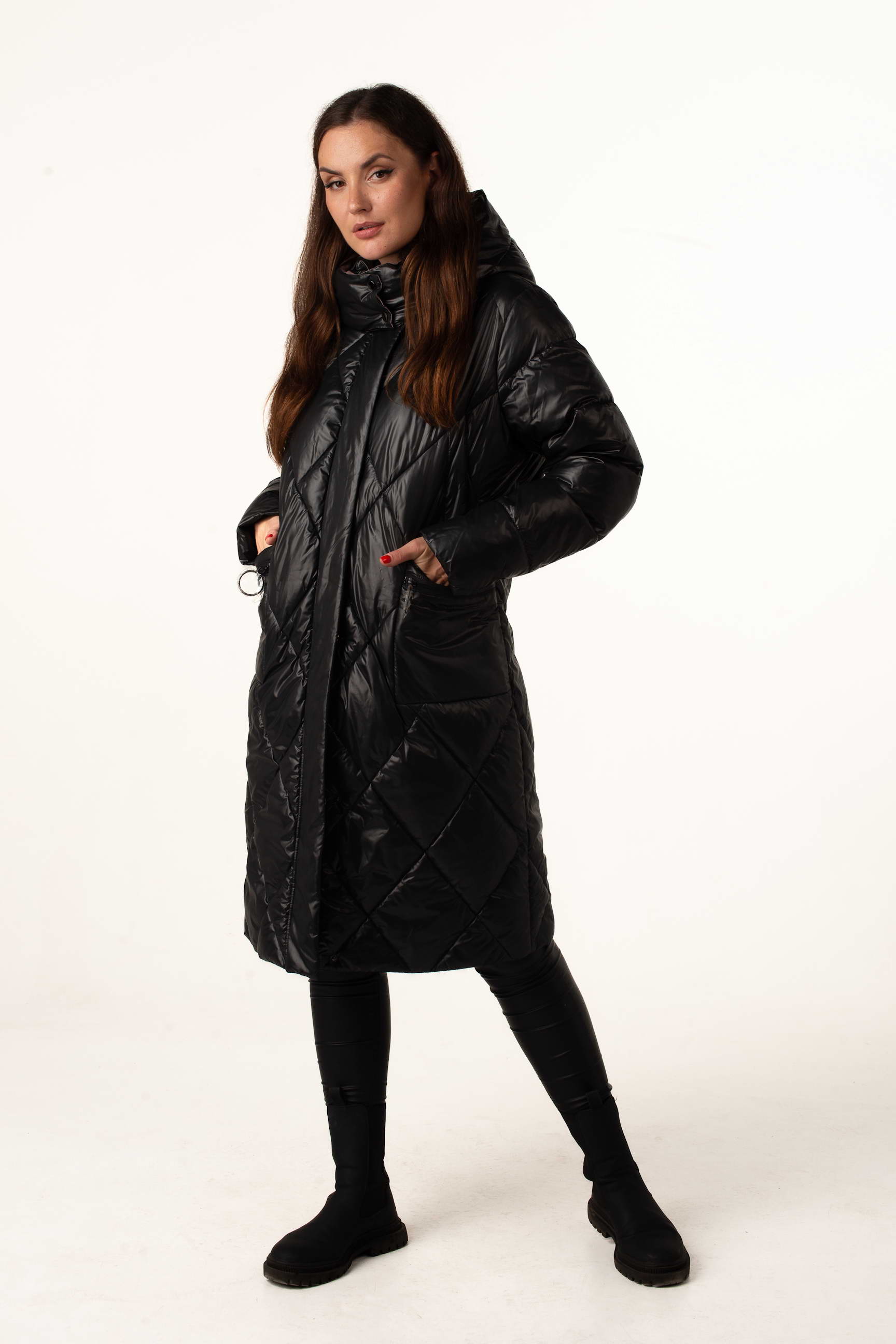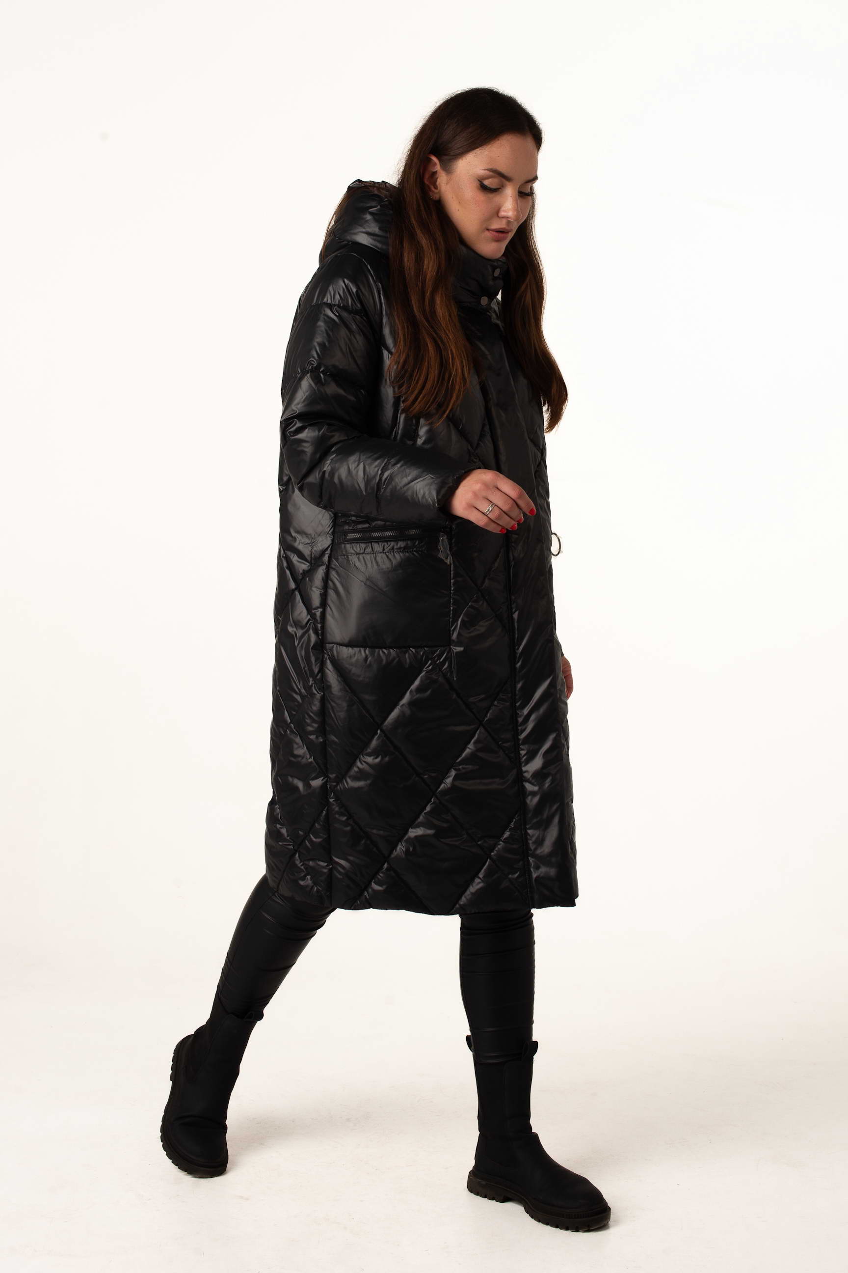 Чорний жіночий біопуховик з ромбовою стьожкою та знімним капюшоном – поєднання тепла, комфорту та сучасного стилю. Подовжений фасон забезпечує додатковий захист від холоду і вітру.