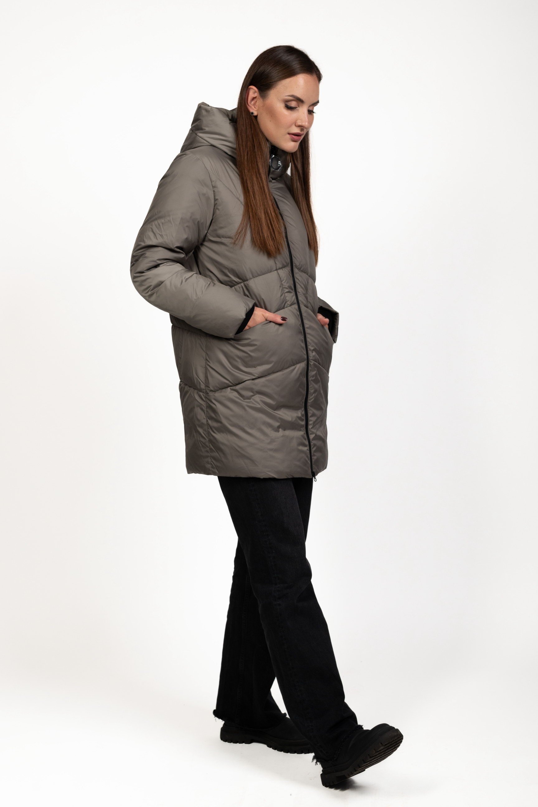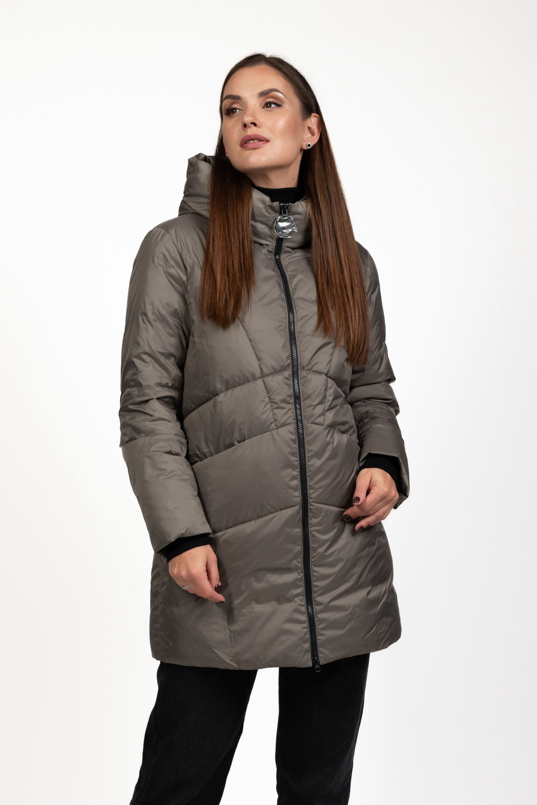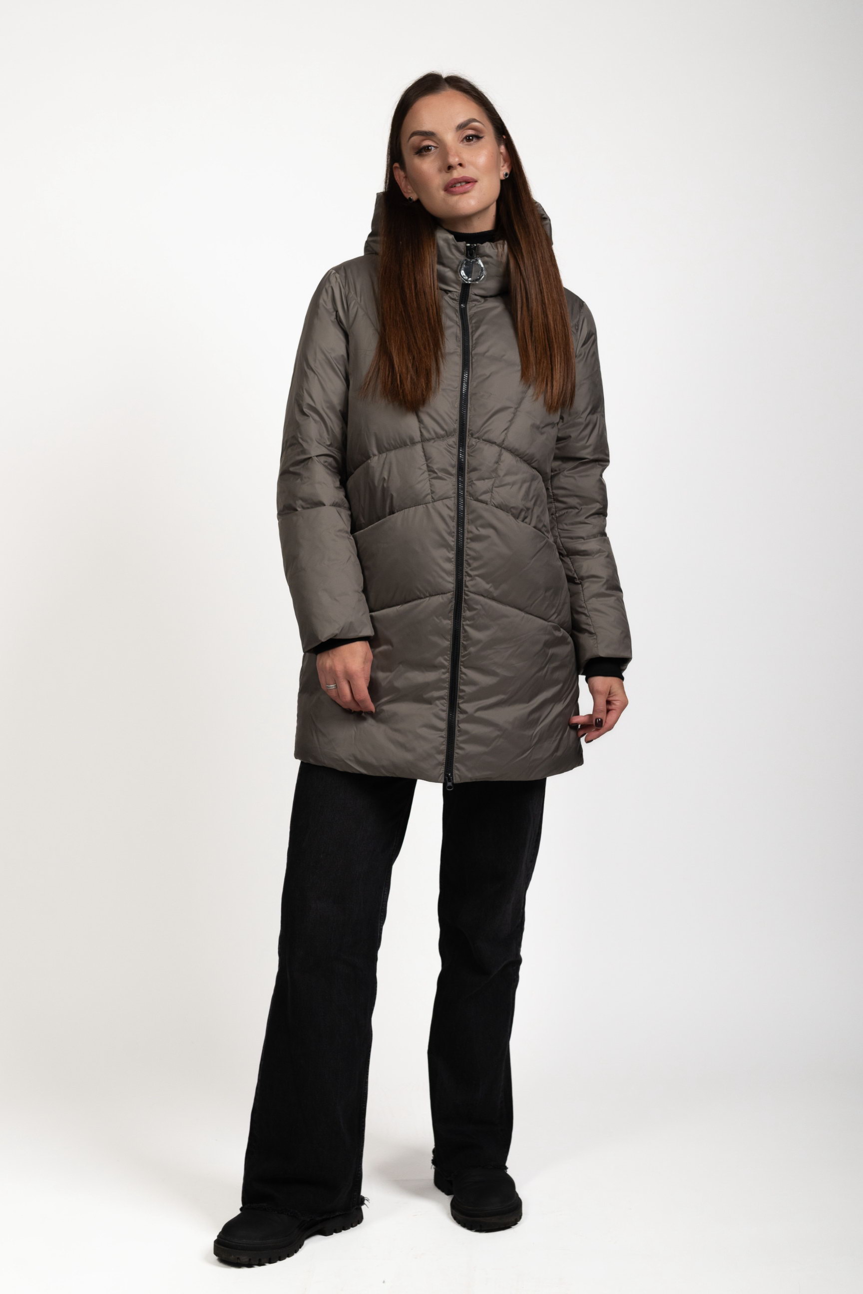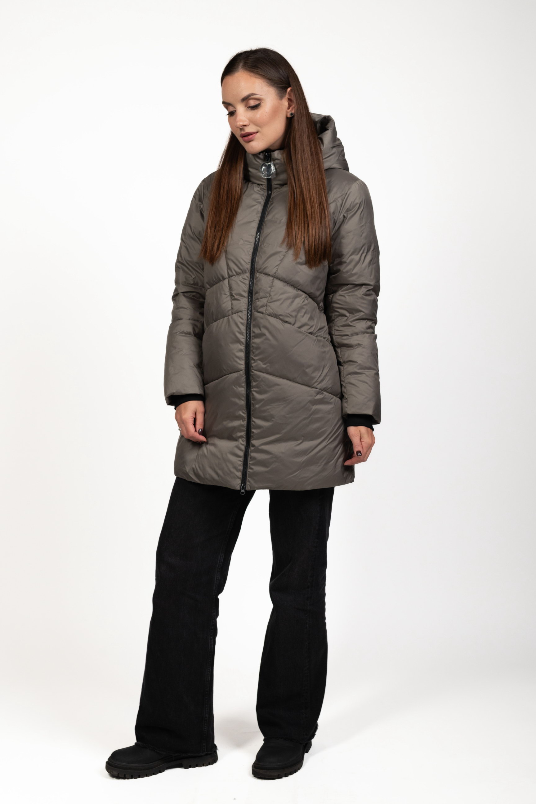 Жіночий біопуховик сірого кольору поєднує стиль і функціональність, забезпечуючи тепло та комфорт у холодну пору року.
