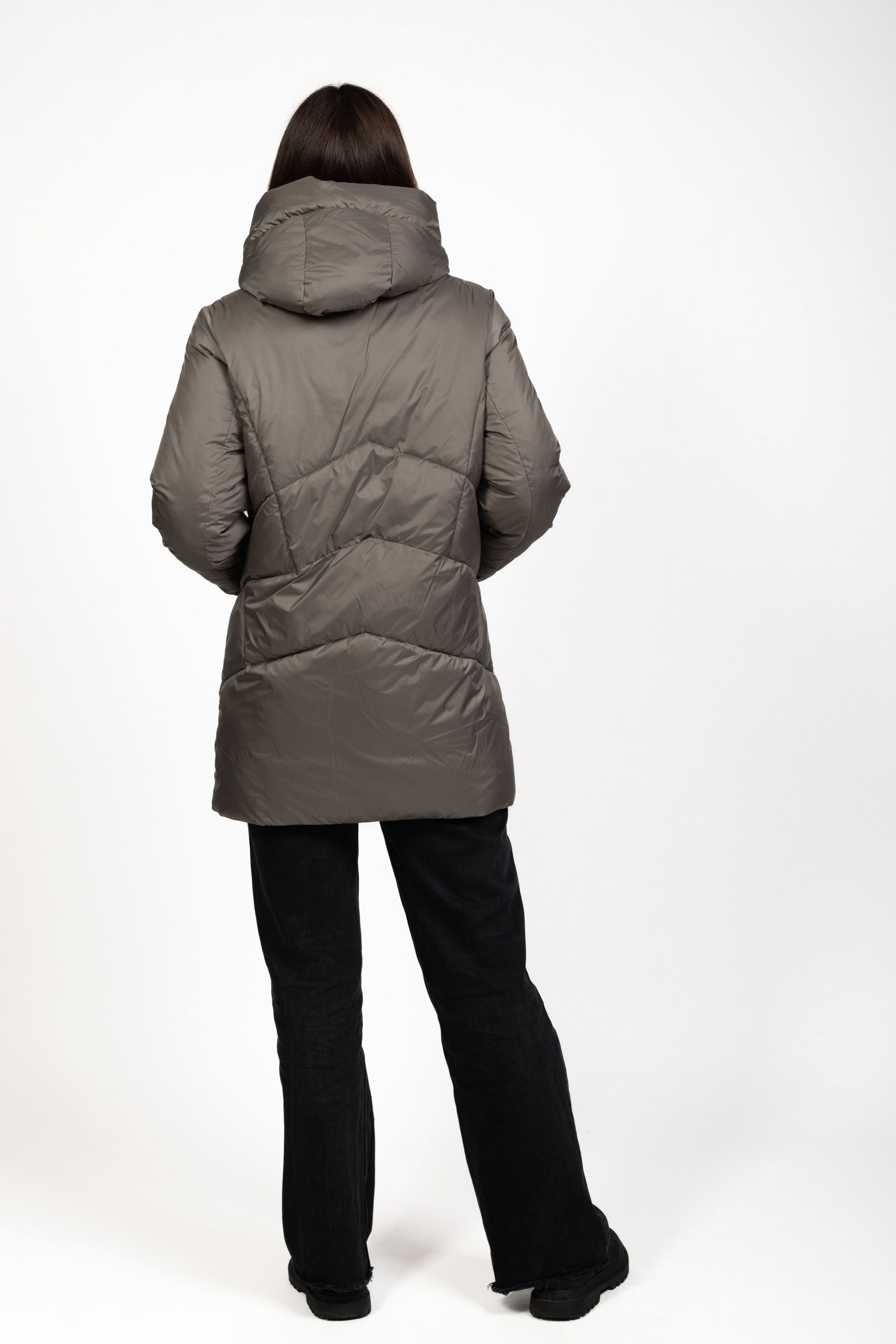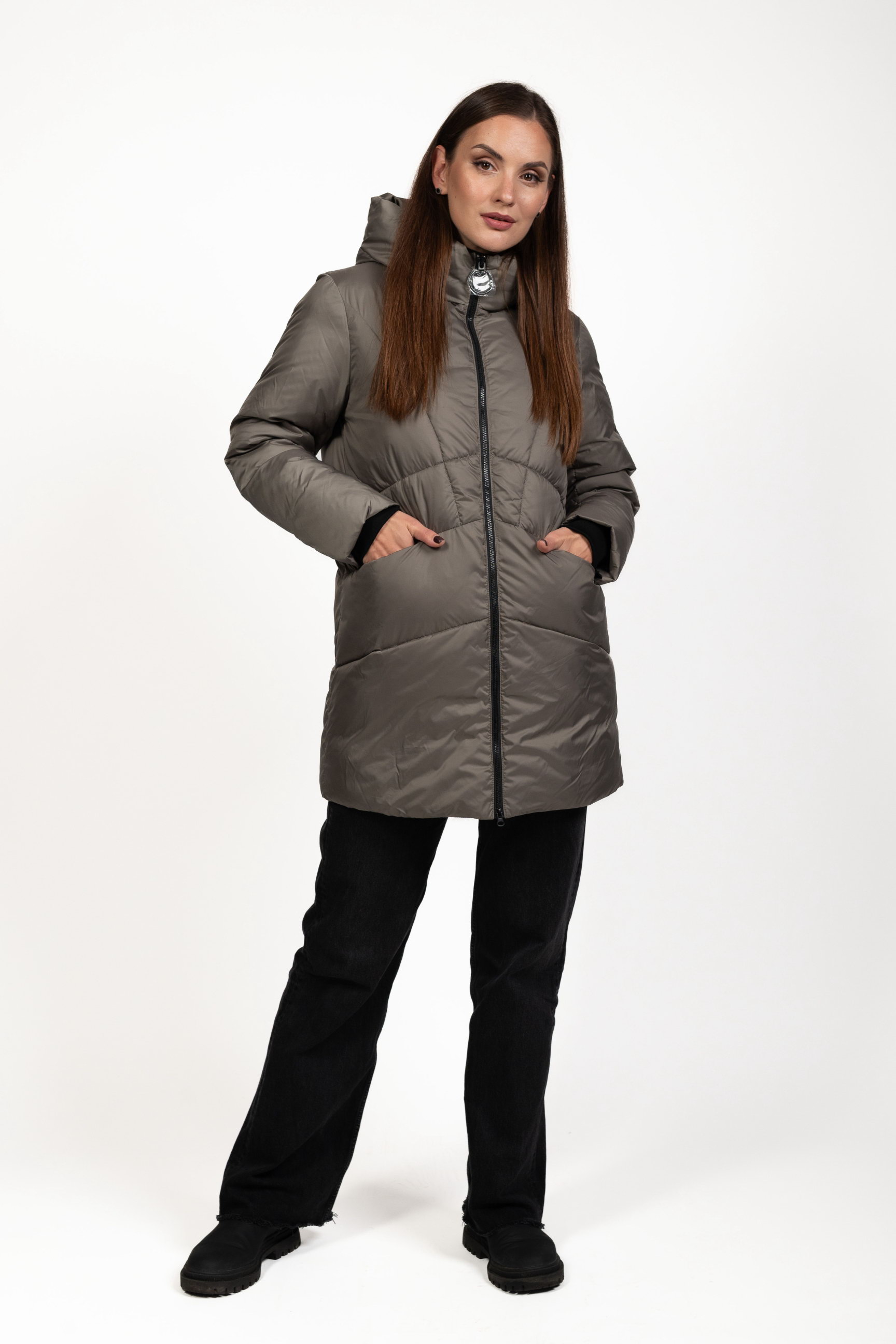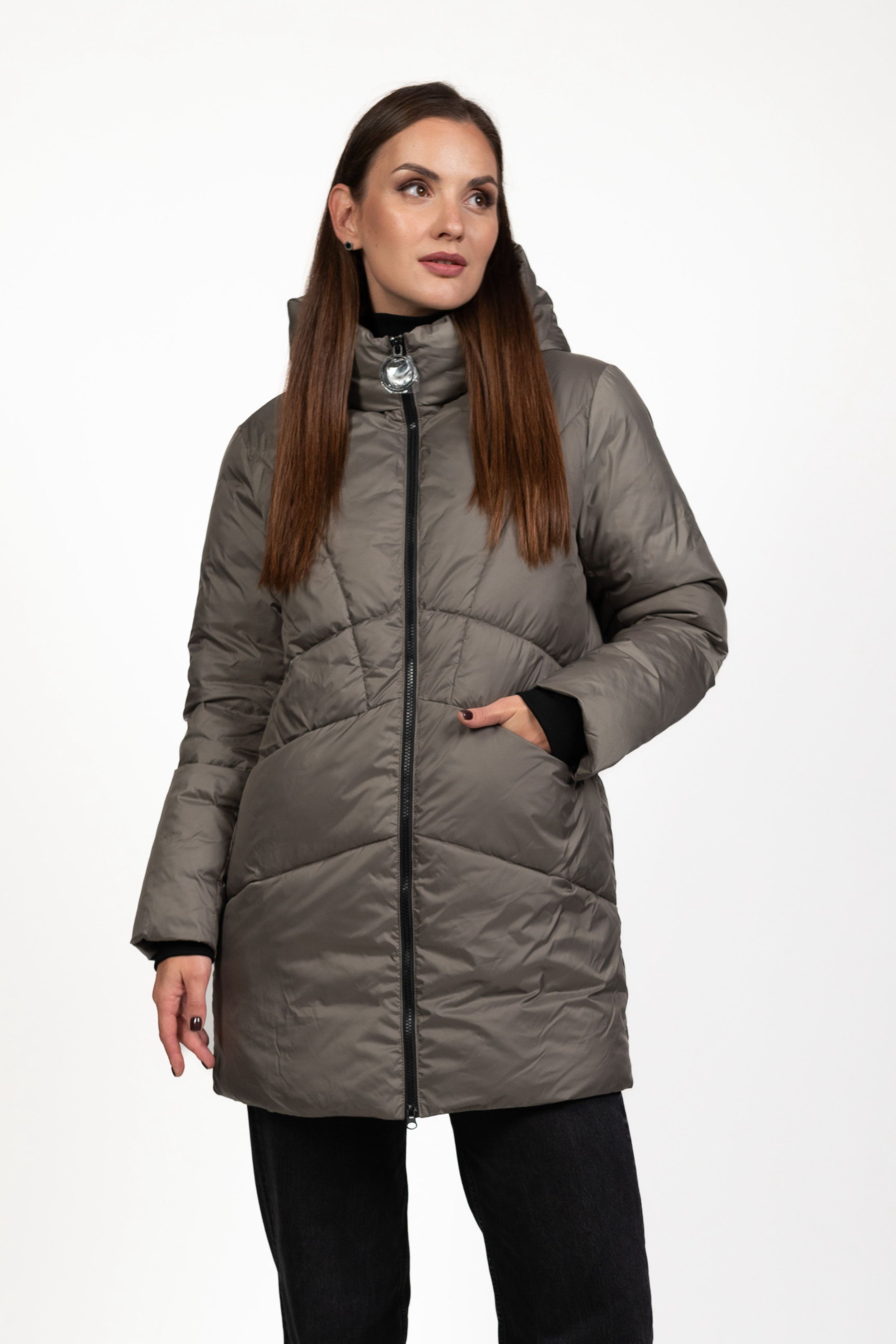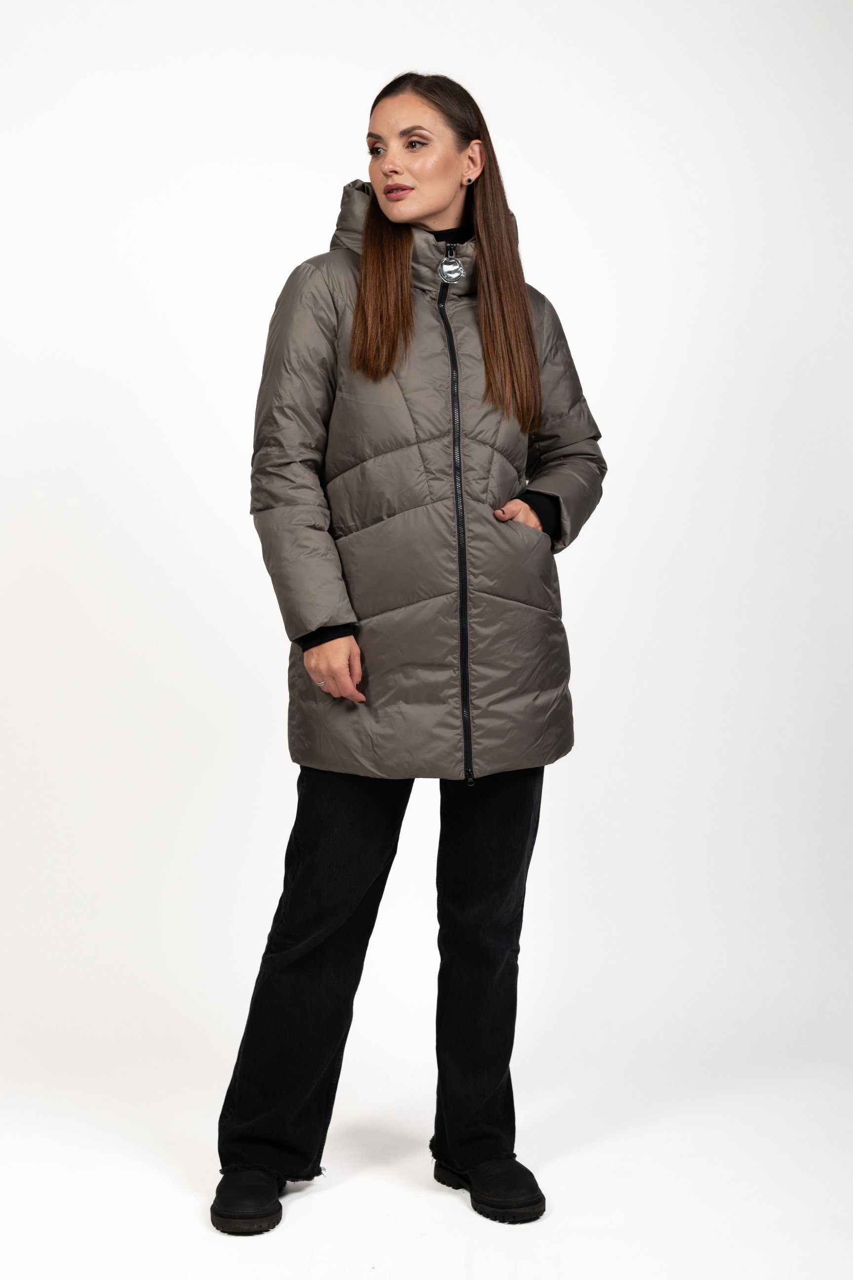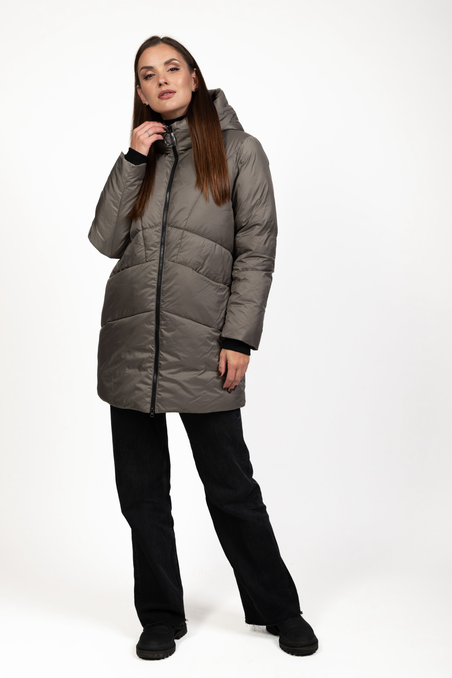 Жіночий біопуховик сірого кольору поєднує стиль і функціональність, забезпечуючи тепло та комфорт у холодну пору року.