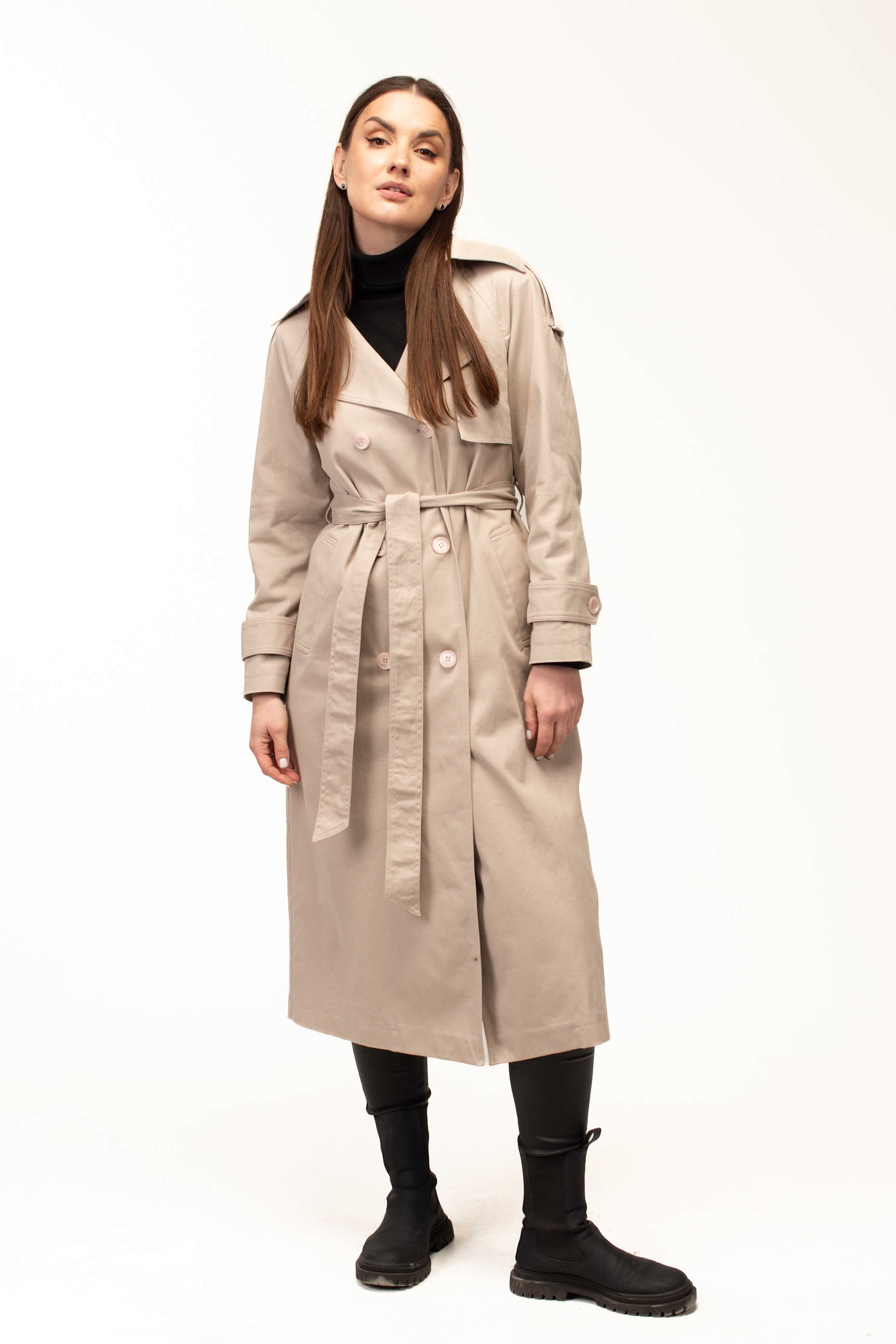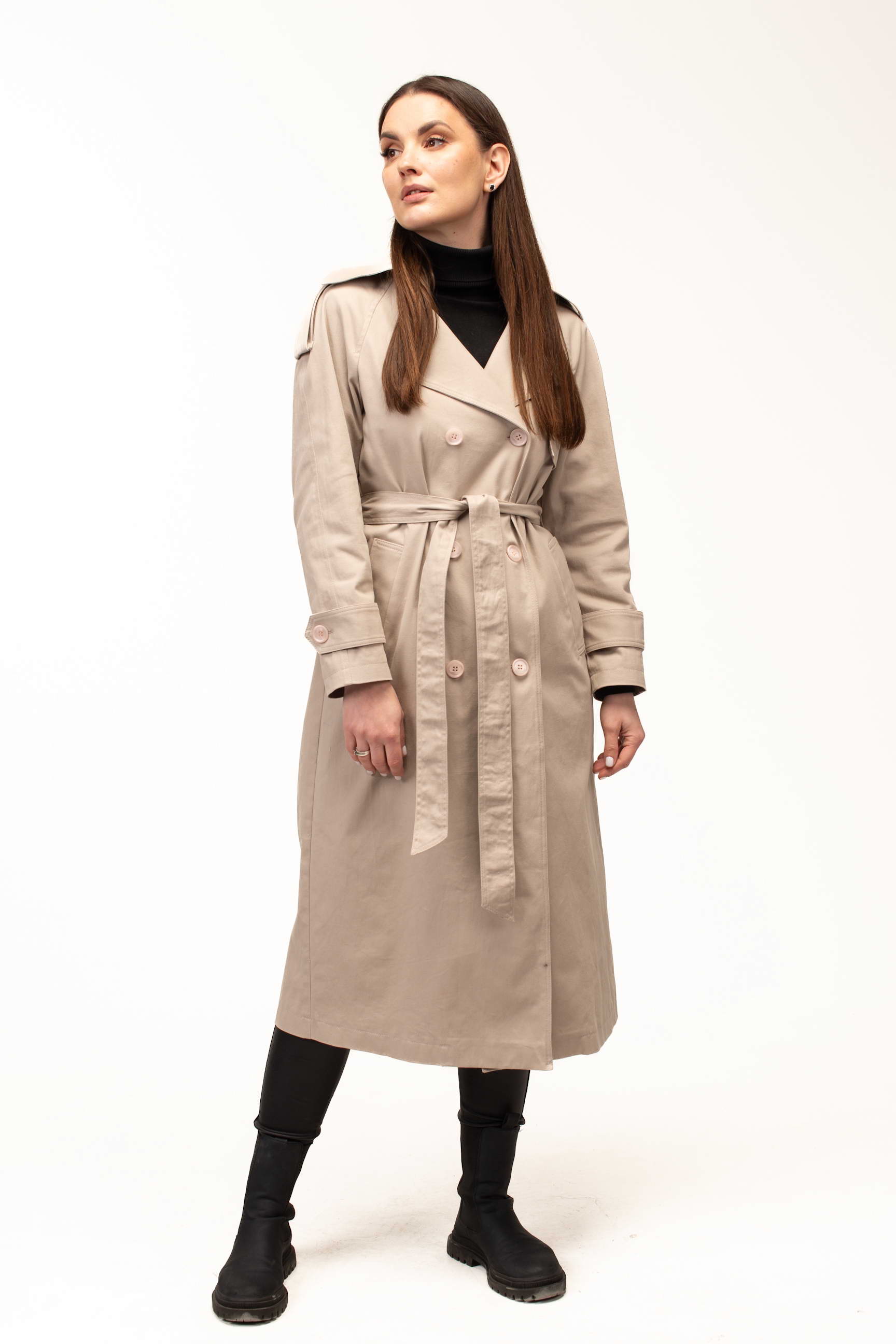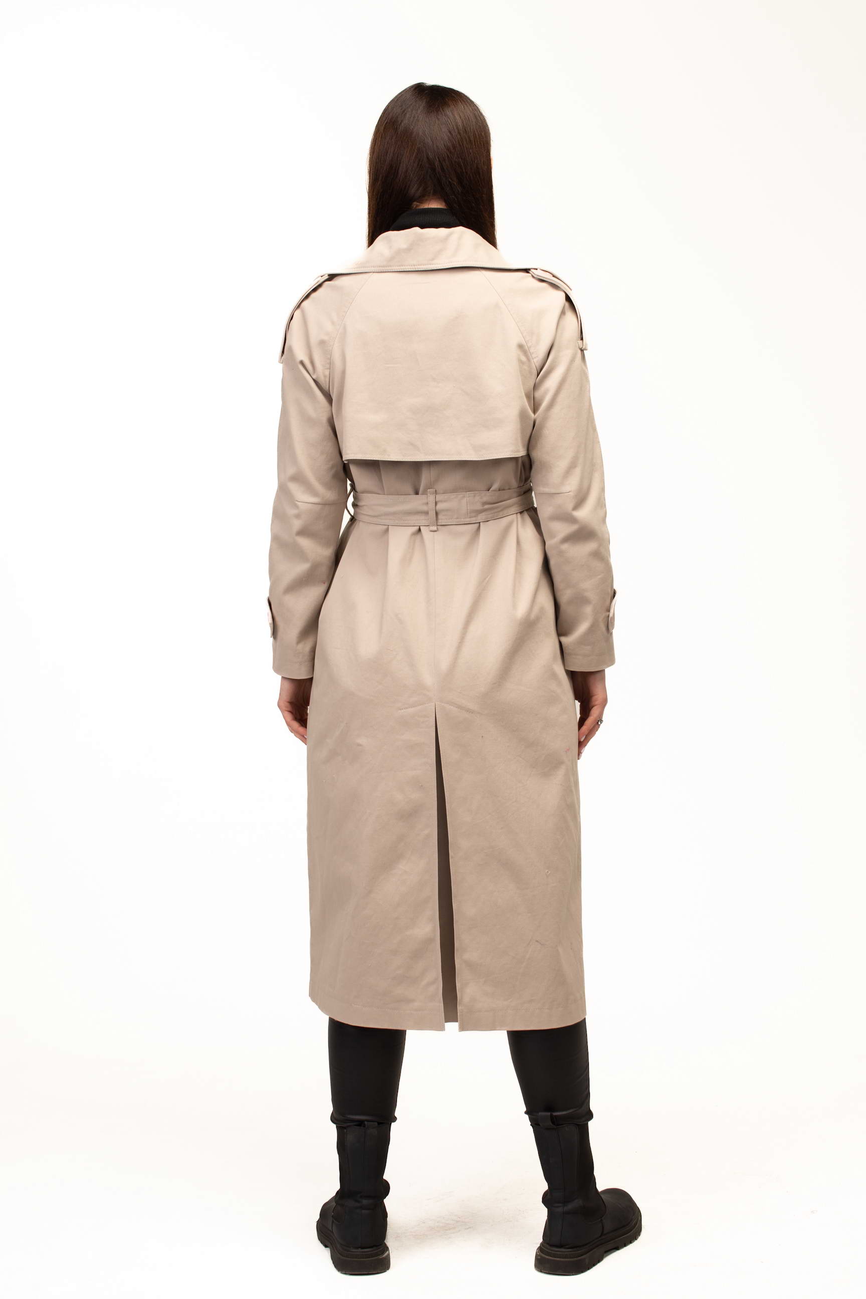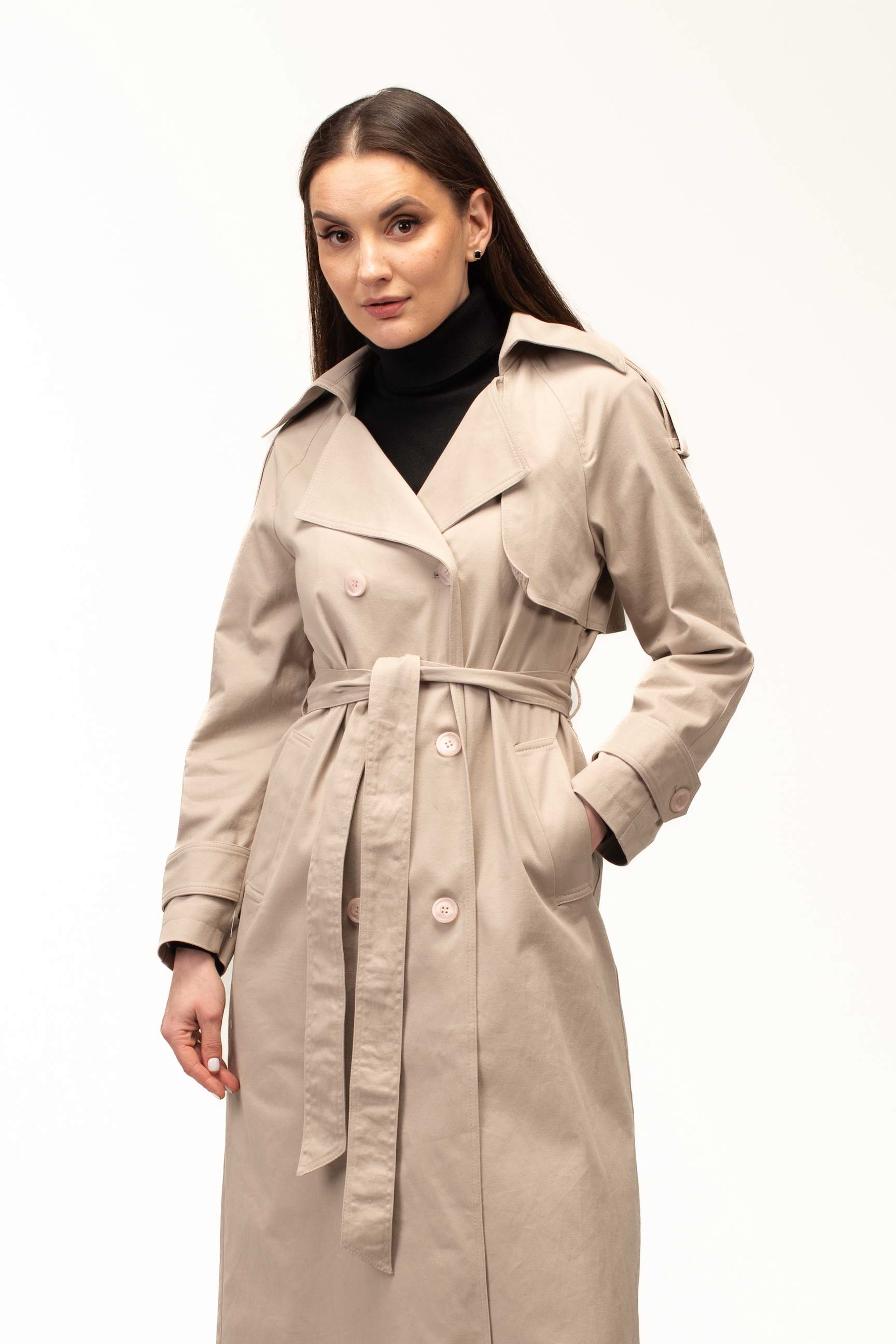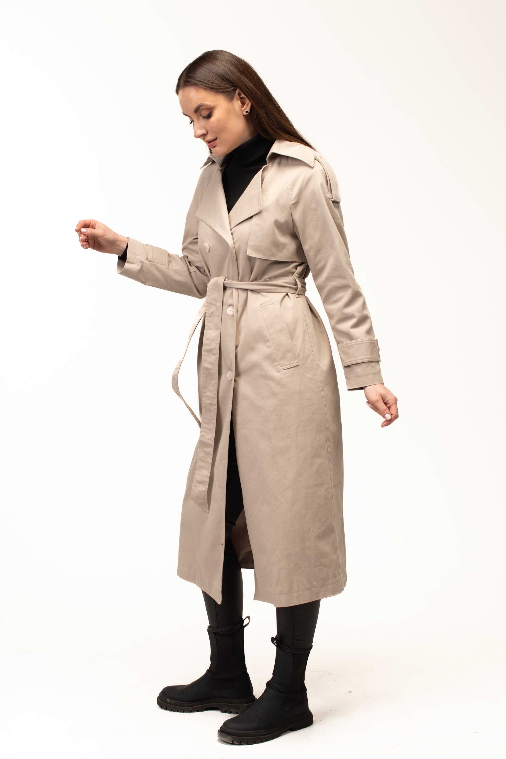 Бежевий колір додає тренчу витонченості та універсальності, роблячи його базовою річчю для створення стильних образів. Він легко поєднується як зі світлими, так і з темними відтінками, дозволяючи формувати гармонійні луки для будь-якої ситуації — від ділових зустрічей до прогулянок містом.