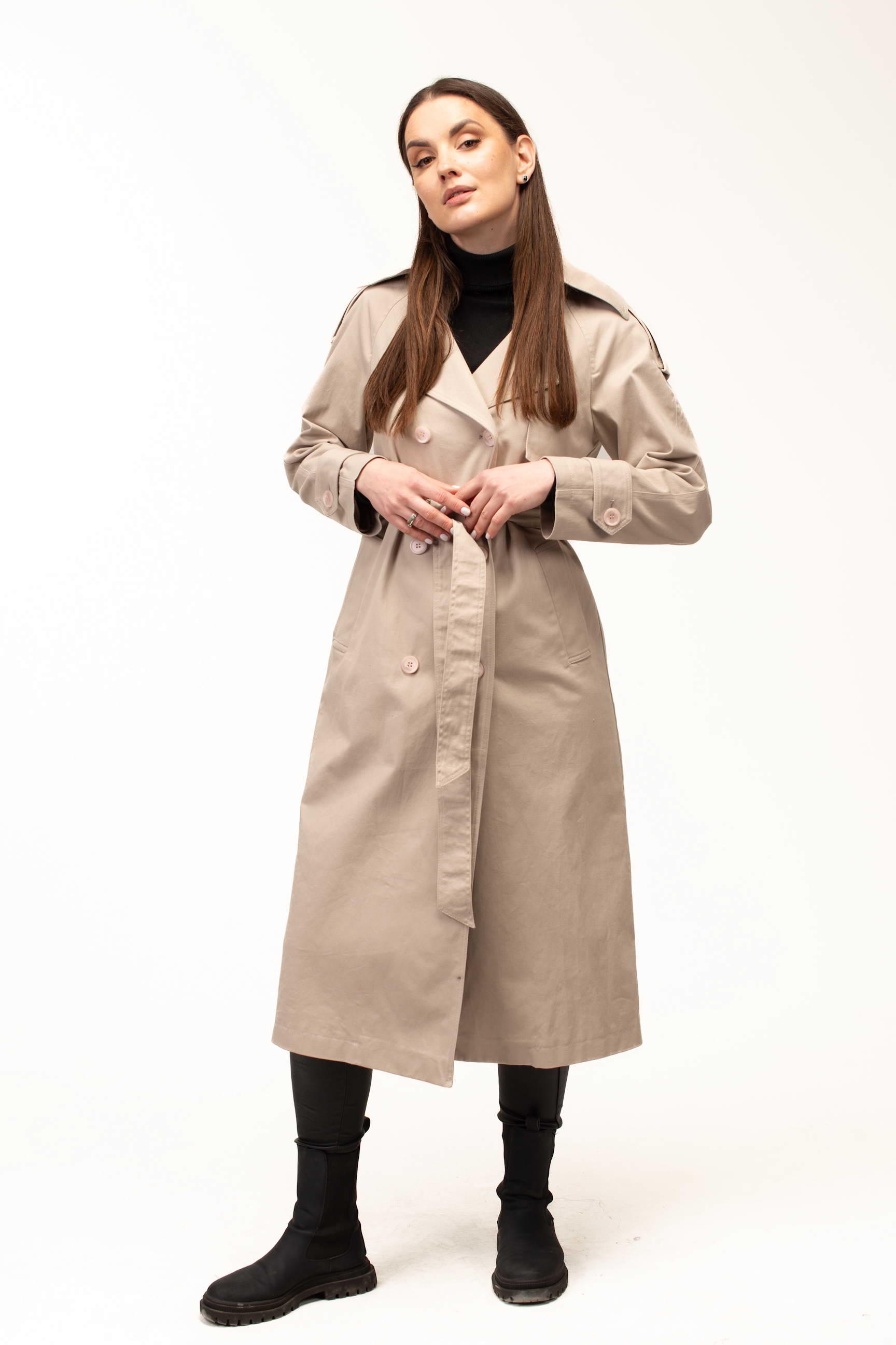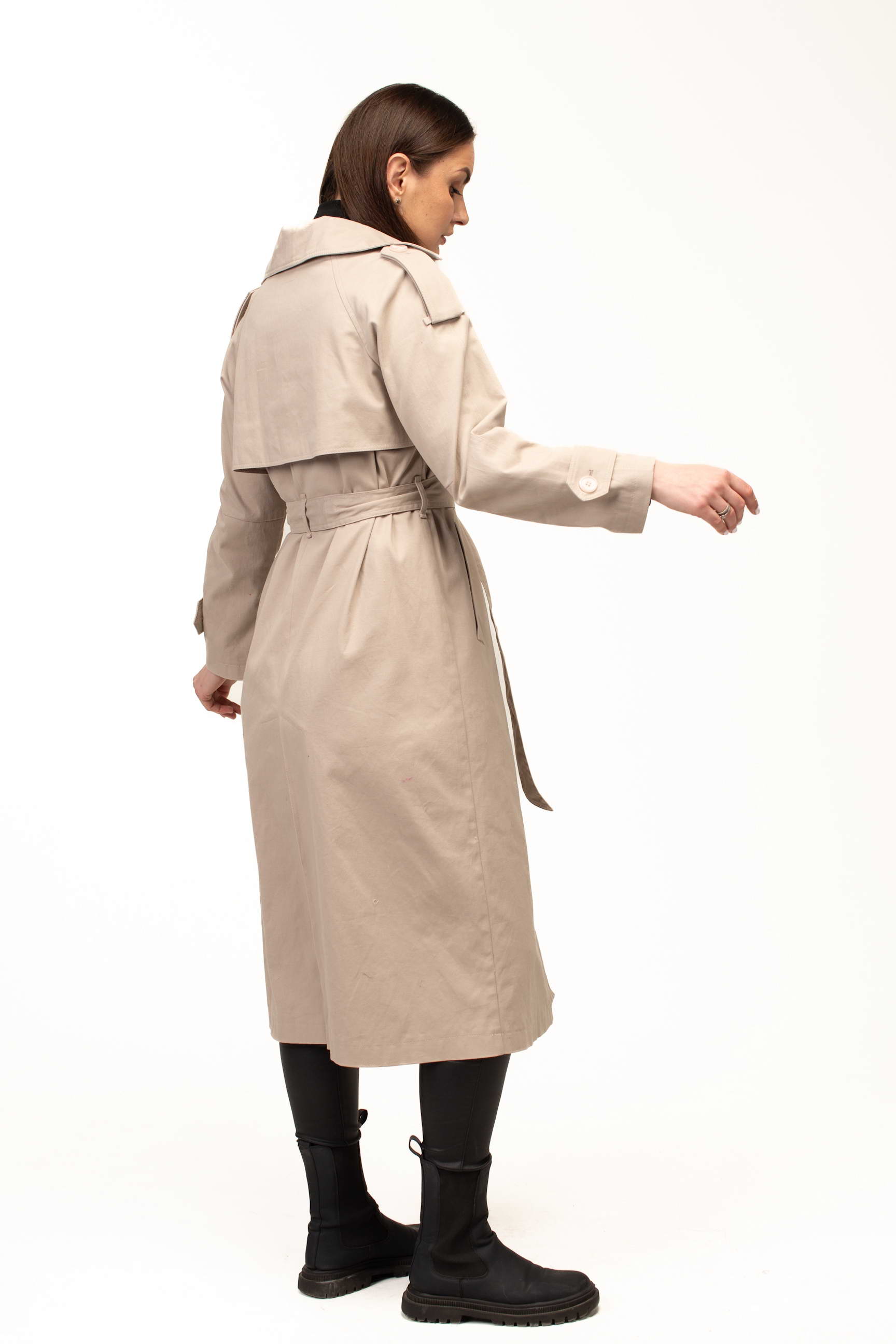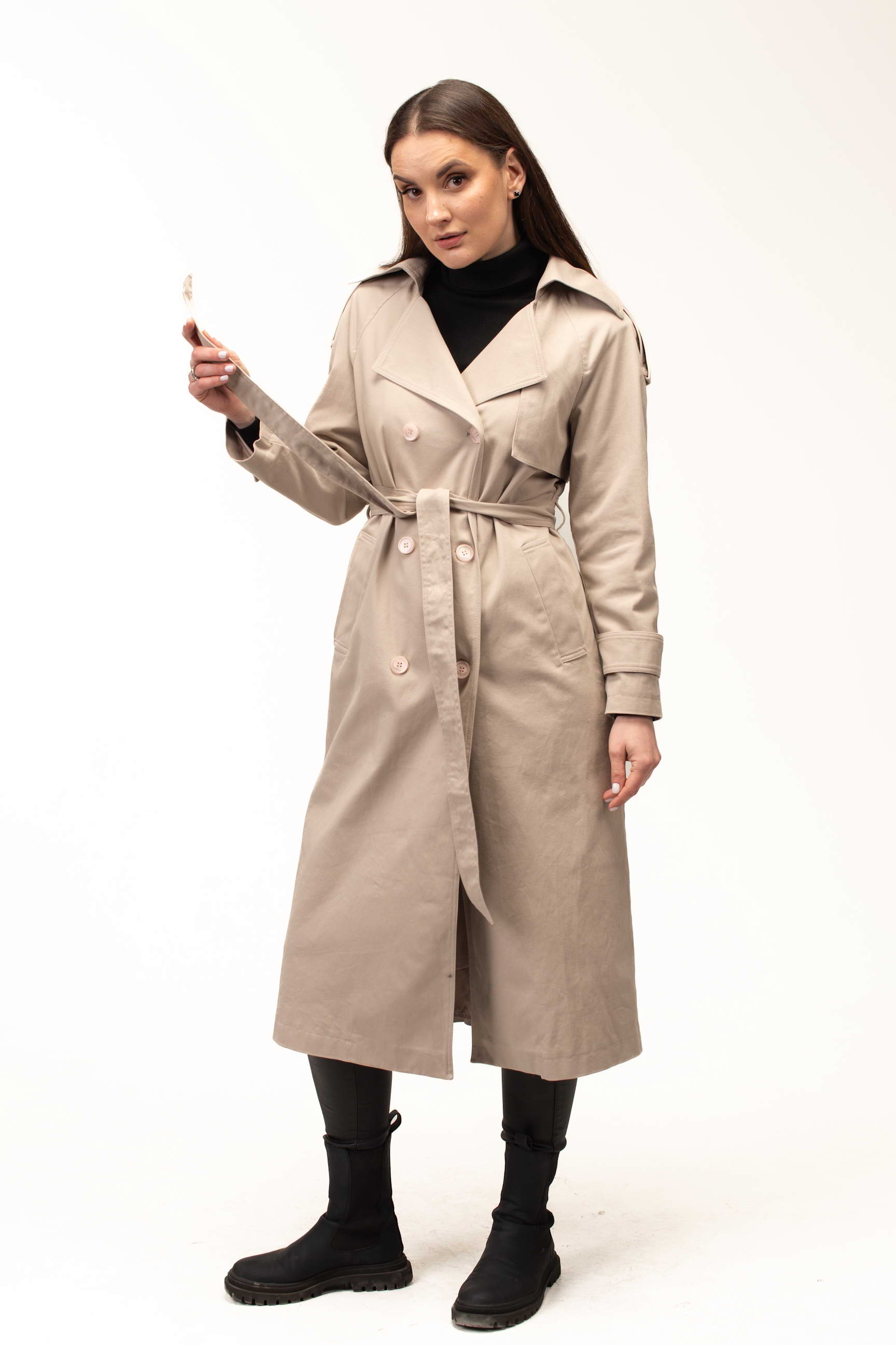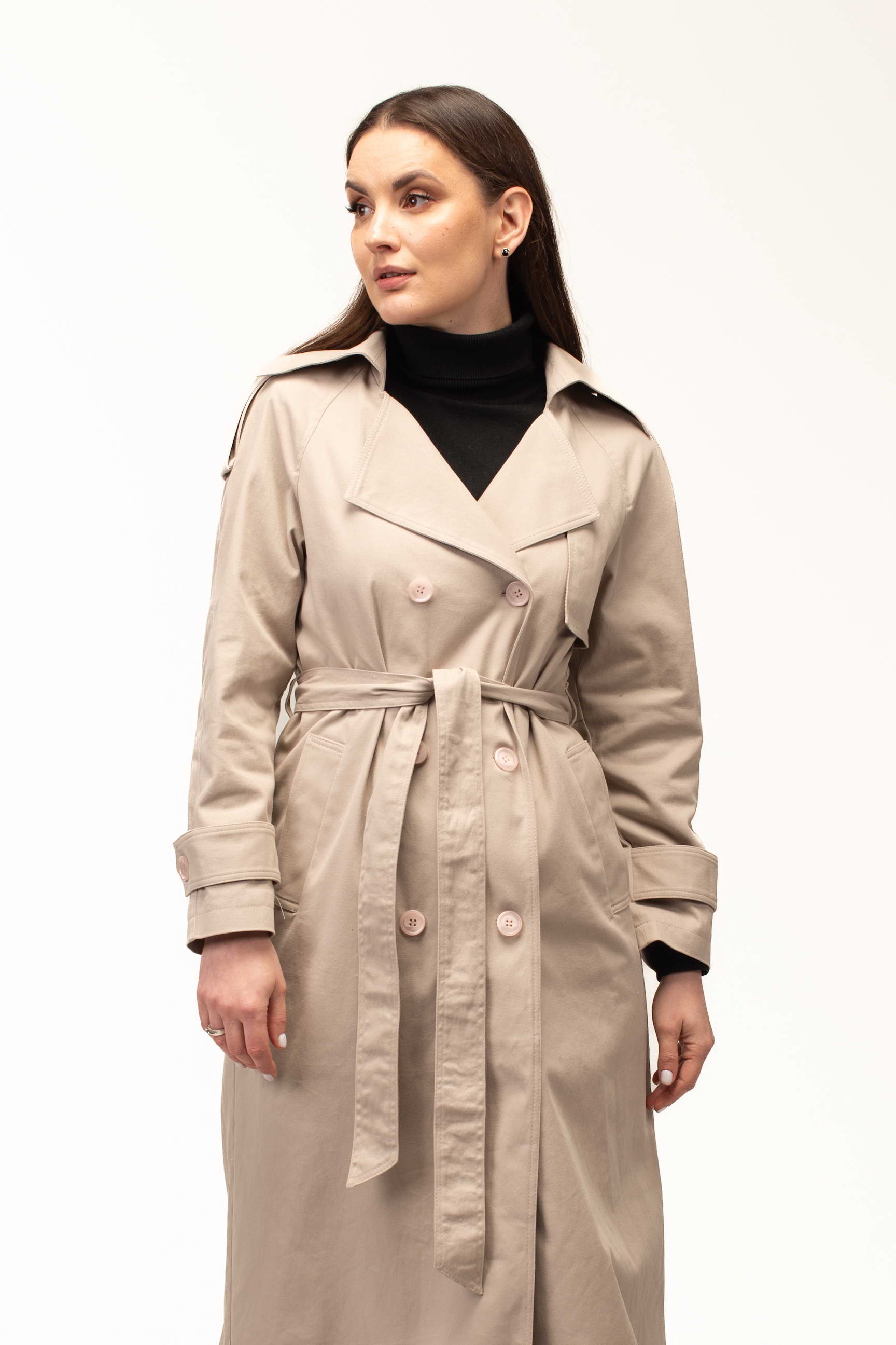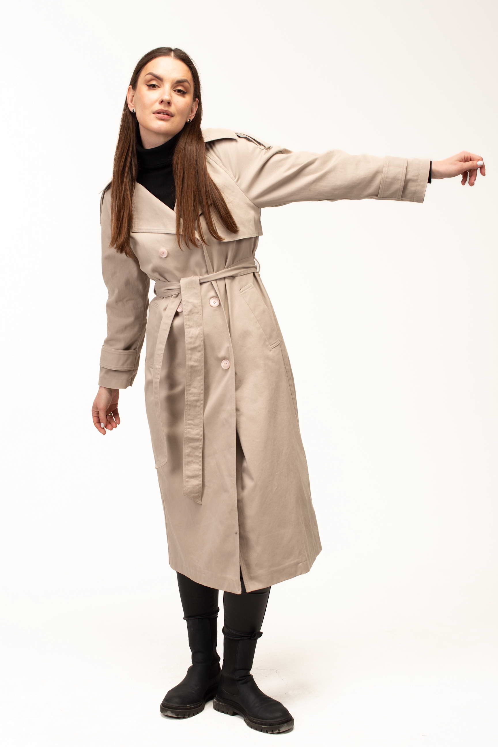 Бежевий колір додає тренчу витонченості та універсальності, роблячи його базовою річчю для створення стильних образів. Він легко поєднується як зі світлими, так і з темними відтінками, дозволяючи формувати гармонійні луки для будь-якої ситуації — від ділових зустрічей до прогулянок містом.