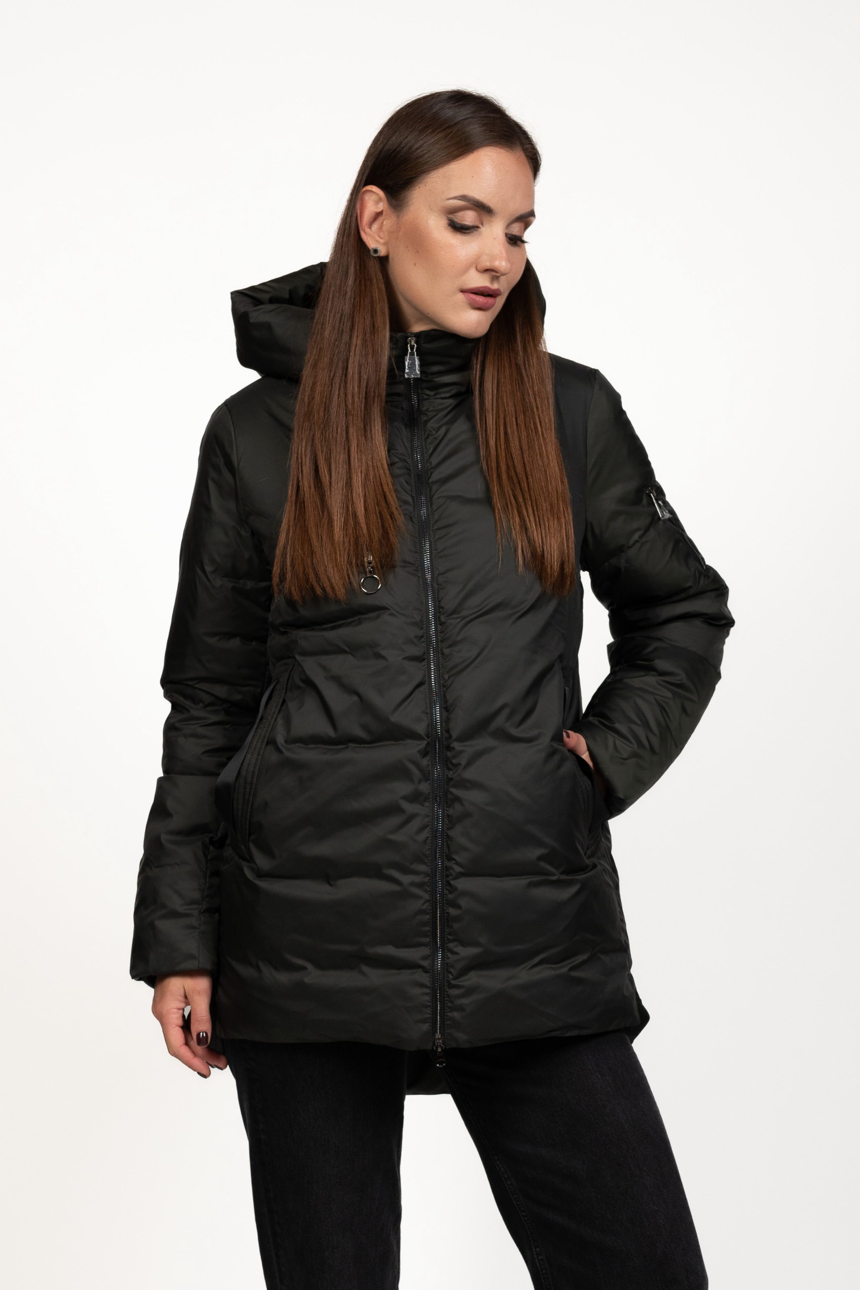 Декоративна блискавка на грудях додає пуховику стильного акценту та сучасного вигляду.